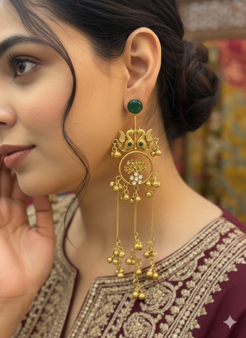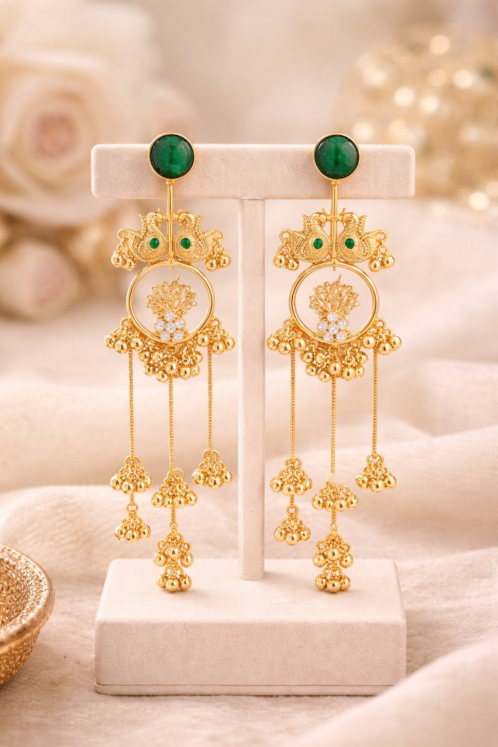 Inspired by Kashmiri heritage, these elegant gold earrings feature intricate peacock motifs, emerald accents, and delicate ghungroo tassels that sway gracefully. The finely detailed design blends tradition with sophistication, making them perfect for festive occasions, weddings, and celebrations. A timeless statement piece that adds regal charm and cultural elegance to any ensemble.
